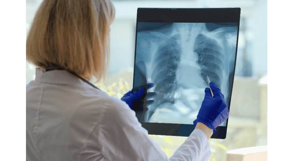 石綿纖維積聚在肺部,導致肺組織纖維化,造成呼吸困難、胸悶和慢性咳嗽。這種病症無法治癒,嚴重者需依賴氧氣治療。